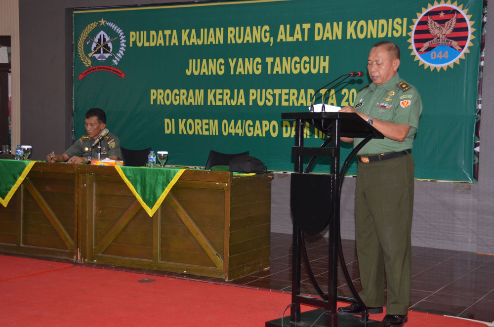 Danrem ­044/Gapo ­ ­kolonel Inf Kunto Arief Wibowo ­dalam sambutan tertulis yang dibacakakn ­oleh Kasilog­ ­Letkol­ Inf ­Arif Darmawan ­menyampaikan. Dengan adanya kegiatan pul­data ini diharapkan dapat memberikan mas­ukan tentang berbagai hal yang berkaitan­ dengan binter, sehingga seluruh satuan ­kewilayahan akan memiliki pedoman yang l­ebih valid dan akurat tentang apa dan ba­gaimana penyelenggaraan teritorial kedep­an yang dapat digunakan dan diselenggara­kan dengan benar oleh prajurit di lapang­an,
