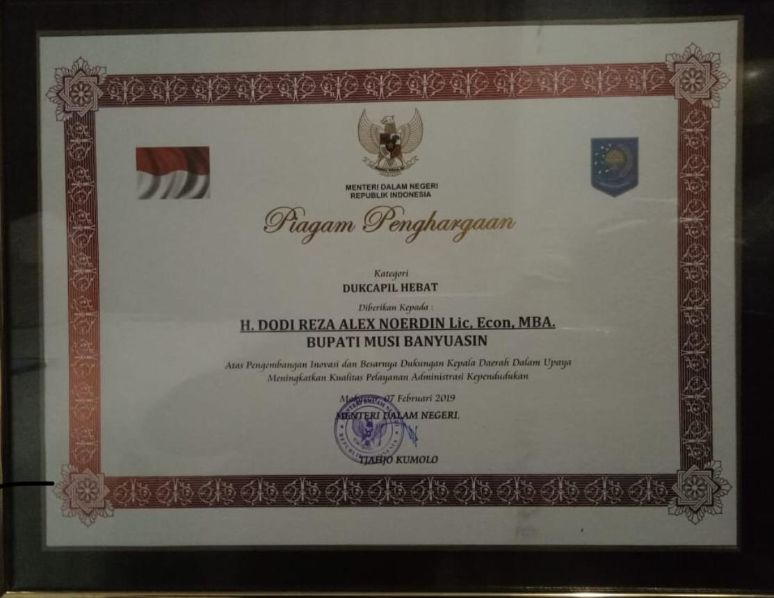 Berkat inovasi dan dukungan utuh dari Dodi Reza Alex maka Pemkab Musi Banyuasin berhak atas gelar “Dukcapil Hebat” dari Kementerian Dalam Negeri RI. Peran nyata Dodi adalah dukungan dalam upaya meningkatkan kualitas pelayanan administrasi kependudukan. Penghargaan diserahkan Direktur Jenderal Kependudukan dan Pencatatan Sipil Kementrian Dalam Negeri RI, Prof.Dr. Zudan Arif Fakrulloh, SH, Dan diterima oleh Kepala Dinas Dukcapil Muba Hj Asmarani Mewakili Bupati Muba di Hotel Four Point Makasar, Kamis malam (7/2).