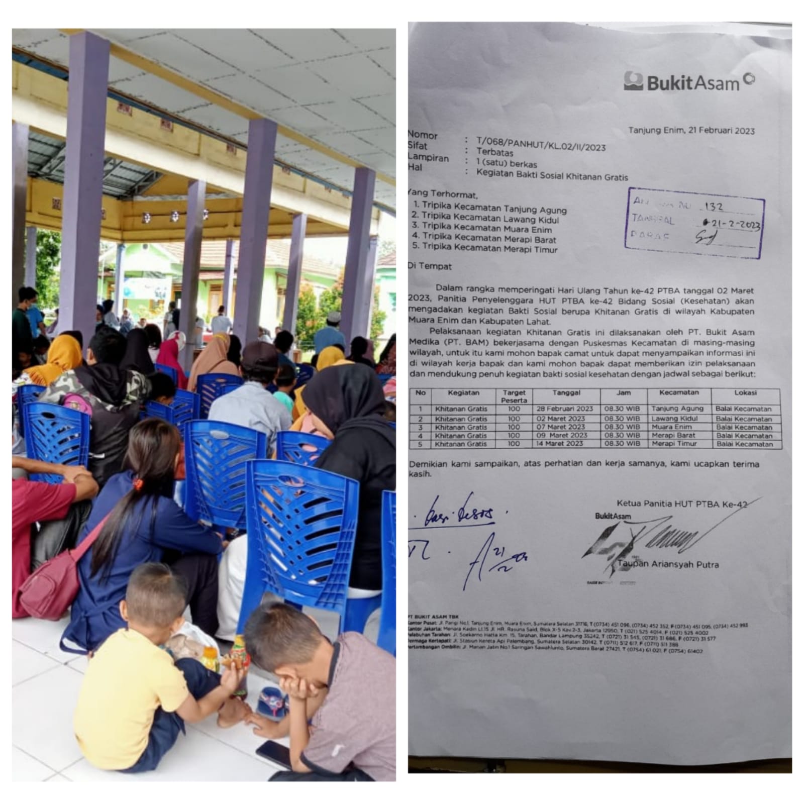 Muara Enim, Halisumsel.co,id (02/03) terbatasnya kuota khitanan massal yang digelar oleh PT Bukit Asam Tbk dalam rangka HUT ke 42 tahun 2023. Membuat beberapa masyarakat miskin kota yang ada di kota Tanjung Enim Kecamatan Lawang Kidul kabupaten Muara Enim. terpaksa harus menelan kekecewaan Hal ini dikarenakan tidak bisa lagi mendaftar di Kelurahan salah satunya di kelurahan Pasar Tanjung Enim. Sebagai peserta khitanan massal yang di gelar hari ini Kamis (02/03) bertempat di Balai kecamatan Lawang Kidul.