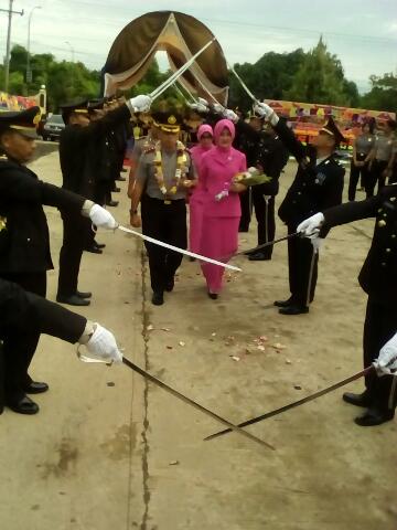 Selain disambut oleh mantan Kapolres Banyuasin AKBP Prasetyo Rahmat Purboyo, kehadiran Kapolres Banyuasin yang baru AKBP Andri Sudarmadi itu juga disambut dengan pedang pora kehadiran saat kedatangan memasuki halaman Mapores Banyuasin (4/1).