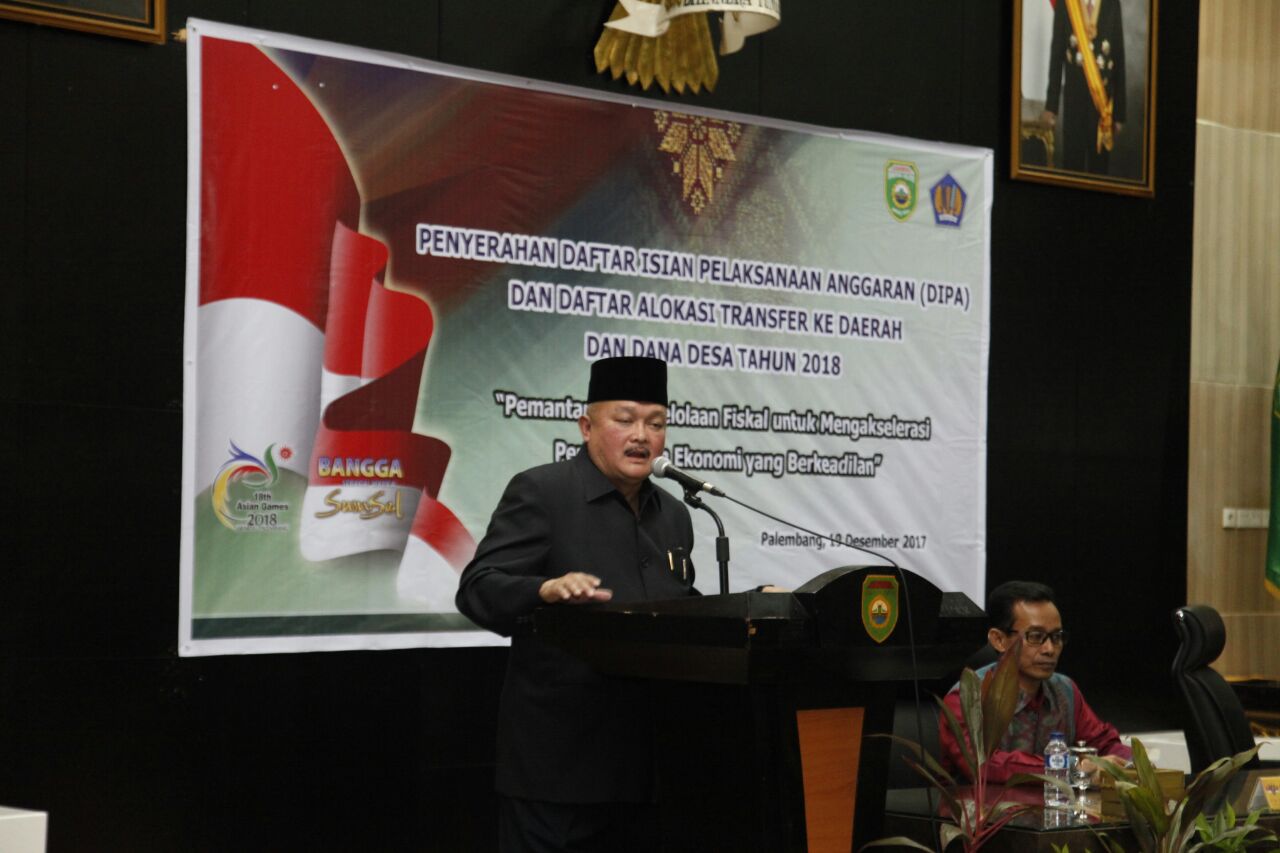 Dalam sambutannya Gubernur Sumatera Selatan H. Alex Noerdin mengatakan, Penyerahan Daftar Alokasi Transfer, Dana Desa q1dan DIPA ini merupakan awal dari rangkaian proses pelaksanaan APBN tahun 2018 yang telah disepakati oleh Dewan Perwakilan Rakyat (DPR) bersama Pemerintah. Ia menuturkan, penyerahan DIPA tahun 2018 ini dilakukan lebih awal, agar pelaksanaan pembangunan dan pencairan anggaran di Pusat dan Daerah dapat lebih baik lagi dari tahun 2017, guna menunjukkan langkah nyata serta manfaat kepada seluruh Rakyat Indonesia khususnya pada Provinsi Sumsel.