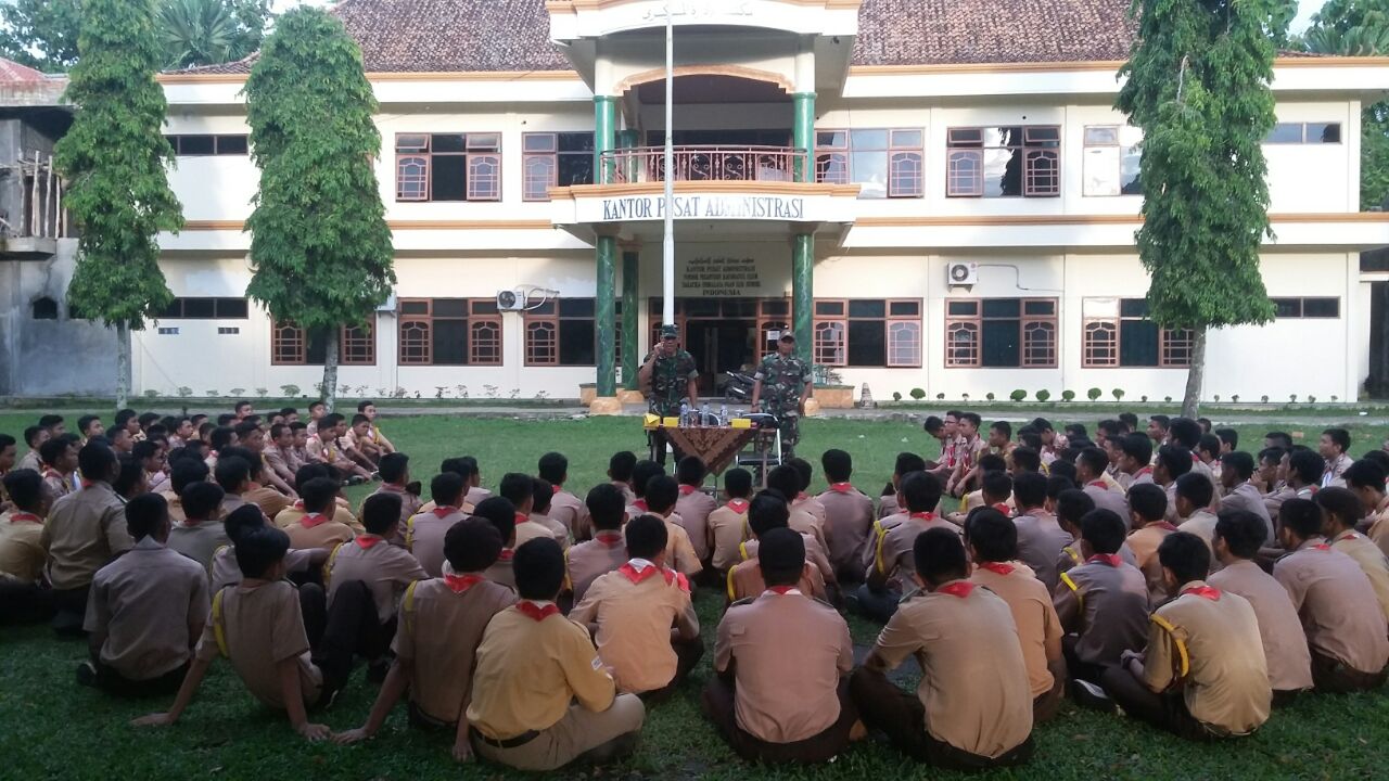 Anggota Koramil 40207/Indralaya Jajaran Kodim 0402/OKI Pelda Suharjo memberi pengarahan kepada siswa-siswi Sanawiyah dan Aliyah Pompes (Raudhatul Ulum) di Indralaya Ogan Ilir tentang tentang kepramukaan, PBB, PPM dan Upacara Bendera bertempat di halaman sekolah Aliyah Pompes (Raudhatul Ulum) Minggu 13/11/2016