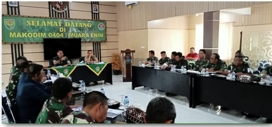 Muaraenim,Halosumsel-Bertempat di Ruang Rapat Makodim 0404, mewakili Bupati Muara Enim, Asisten I Pemerintah Kabupaten (Pemkab) Muara Enim Emran Thabrani didampingi Jajarannya bersama Dandim 0404 diwakili Kasdim Mayor CHB Jauhari didampingi Jajarannya memimpin rapat pemantapan rangkaian kegiatan peringatan Hari Ulang Tahun (HUT) Infanteri ke – 74 tahun 2022.