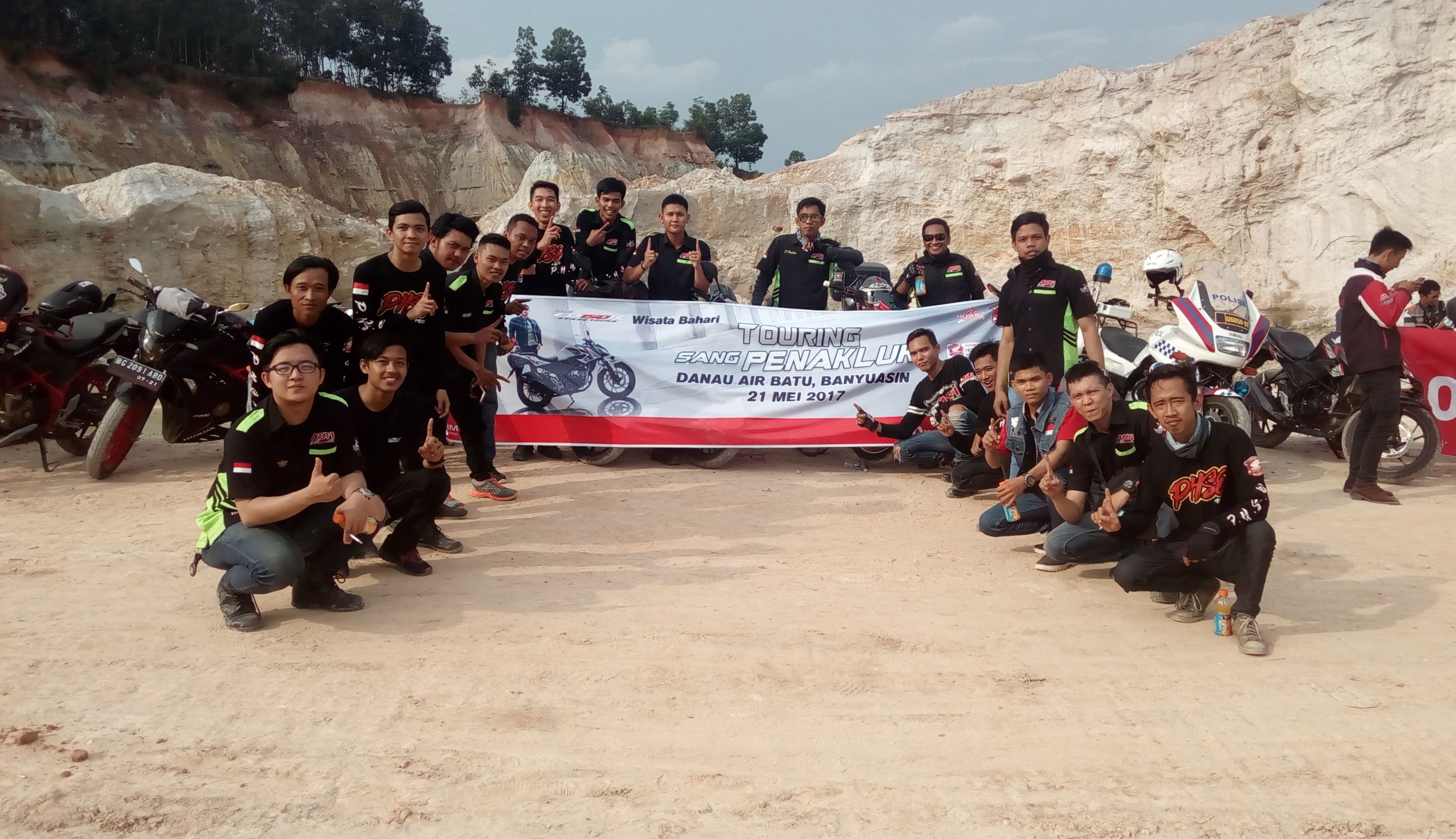 Sesampai di Danau Air Batu, para riders pun beristirahat sejenak sambil menikmati keindahan danau yang berwarna biru kehijau-hijauan ini. Para riders juga menyempatkan untuk mengabadikan momen ini dengan berfoto bersama di lokasi Danau Air Batu yang terbentuk dari hasil galian manusia ini.