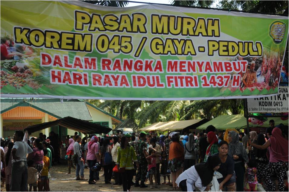 Pembukaan Pasar Murah Korem 045/Gaya Peduli ini dalam rangka menyambut hari raya Idul Fitri 1437 H, Korem 045/Gaya-Peduli bekerja sama dengan Kodim 0413/Bangka dan Disperindag Prov. Babel