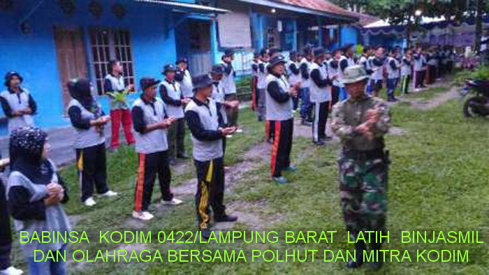 Sebagai wujud Kemanunggalan TNI-Rakyat dalam rangka menjalin hubungan baik yang harmonis antara TNI bersama rakyat dan instansi Pemerintah, Babinsa Koramil 422-02/Biha Kodim 0422/Lampung Barat melaksanakan Pembinaan jasmani dan olahraga bersama dengan Satuan Polisi Kehutanan (Polhut) dan Mitra Kodim pada hari Rabu (30/03/16).
