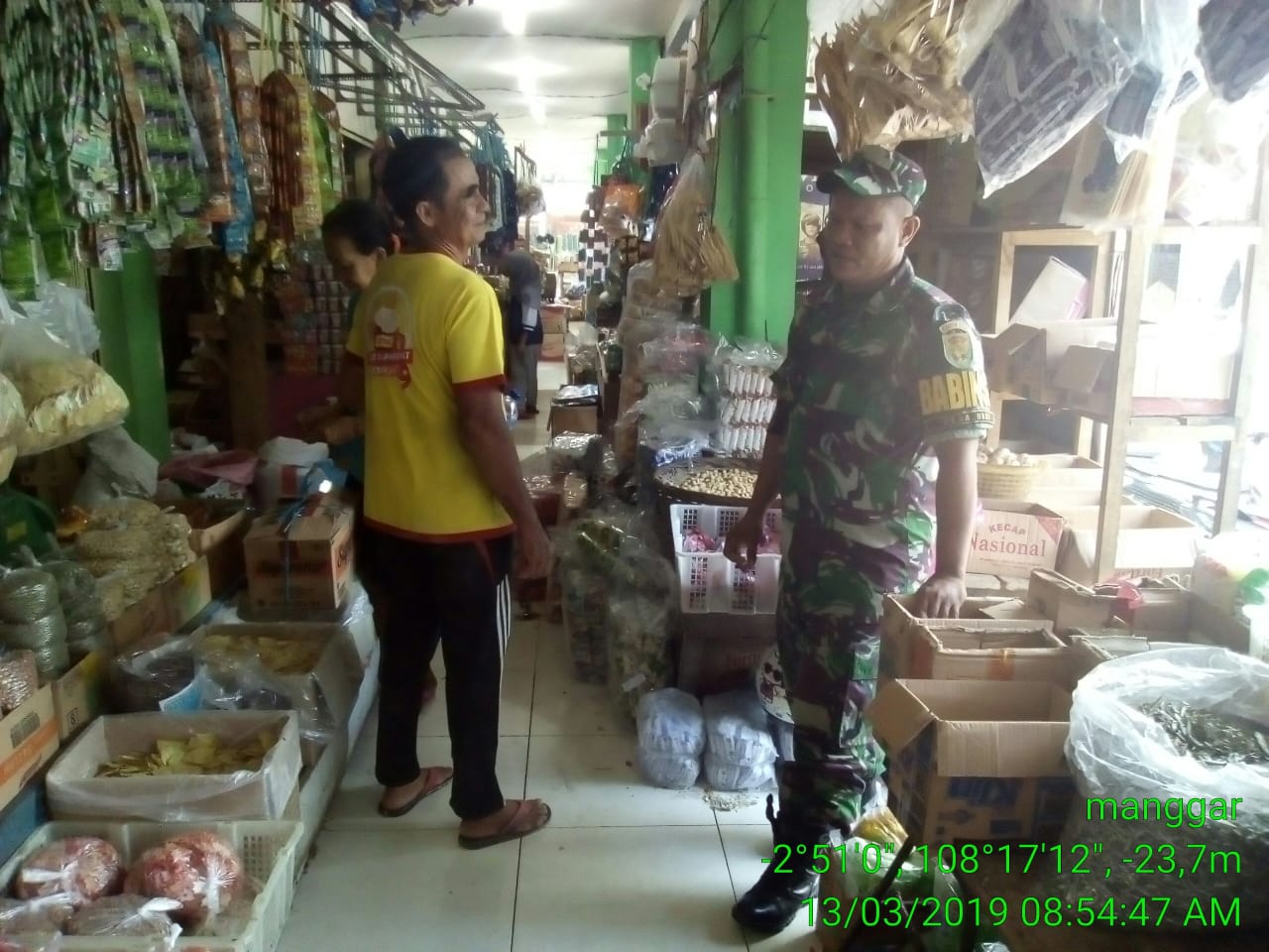 Babinsa Desa Baru Serda Asran anggota Koramil 414-02/Manggar memantau harga -harga kebutuhan pokok masyarakat di Pasar tradisional Lipat Kajang Manggar, Kamis (13/03/19) di  Desa Baru Kec. Manggar  Kabupaten Belitung Timur.
