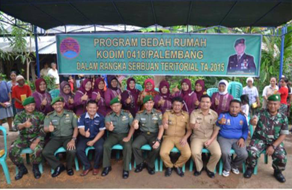 Dandim 0418/Palembang Letnan Kolonel Inf Ichwansyah, S.H. besama perwira Staf dan Babinsa terkait melaksankan serbuan Toritorial bedah rumah sebanyak 10 Unit di Jl Gotong Royong Purwodadi RT 09 RW 02 Kel Sukodadi Kec. Sukarami Palembang, atas nama Sudarsono Umur 40 Tahu”20/1/2016.Bedah rumah tersebut merupakan wujud kepeduluan TNI dalam rangka menyukseskan kegiatan serbuan teritorial yang tersebar diwilayah koramil jajaran Kodim 0418/Palembang.Dicelah-celah kegiatan tersebut Dandim 0418/Palembang Ichwansyah,S.H. mengatakan kegiatan bedah rumah ini mulai dari perencanaan, persiapan, pelaksanaan dan pengakhiran dari Bulan Desember 2015 s.d Januari 2016 Pengerjaan bedah rumah ini pun di lakukan secara bergotong royong oleh anggota Kodim 0418/Palembang dari Koramil Sukarami dengan masyarakat setempat serta berkoordinasi dengan pihak-pihak terkait terutama unsur Muspika diwilayah rumah yang bedah tersebut.Di tempat lain, Dandim 0418/Palembang beserta Camat Sukarami melakukan pengerjaan rumah secara simbolis. Sampai saat ini sudah 4 unit rumah yang sudah selesai di bedah dan 2 unit rumah sedang dalam proses dan sisanya 4 unit yang belum dibedah.Hadir dalam kegiatan tersebut Kasdim 0418/Palembang, Para Pasi Kodim 0418/Palembang, Danramil Jajaran Kodim 0418/Palembang, Babinsa wilayah Sukarami, Camat Sukarami, Lurah Sukodadi dan unsur Muspika lainnya.(rel)