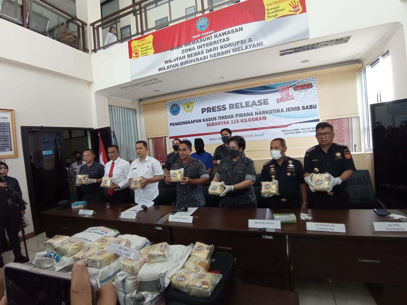 Palembang,Halosumsel- Peredaran Narkoba jenis sabu sabu seberat 115 Kilogram (Kg) berhasil digagalkan oleh Badan Narkotika Nasional Provinsi (BNNP) Sumatera Selatan (Sumsel).