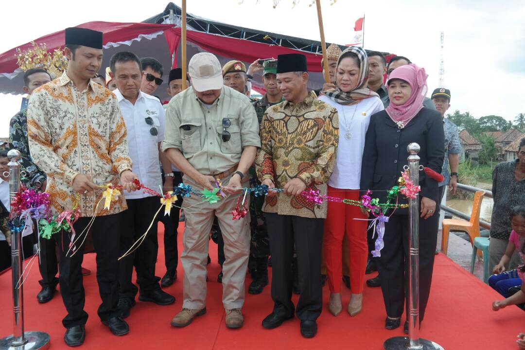 Setelah menyapaikan sambutanya,Gubernur Sumsel H Alex Noerdin langsung memotong pita sebagai tanda di resmikannya jembatan Desa Gunung Batu (sofuan/rel)
