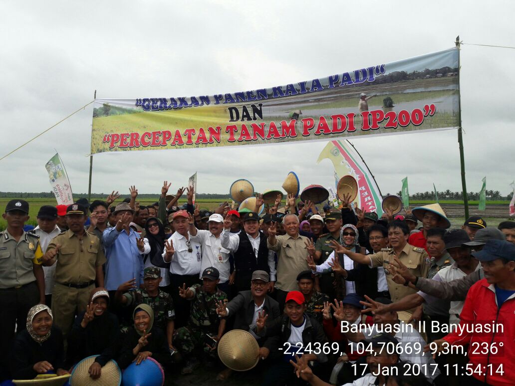Komandan Kodim 0401/Muba Letkol Czi Mulyadi, S.IP. beserta para pejabat yang berkaitan dengan tanaman pangan Provinsi Sumsel dan Gapoktan menyelenggarakan acara panen raya dan tabur perdana benih padi jenis IP-200 serta temu wicara Gapoktan di Desa Jatisari Karang Agung Ilir Kec. Banyuasin II Kab. Banyuasin, Selasa (17/1/17).