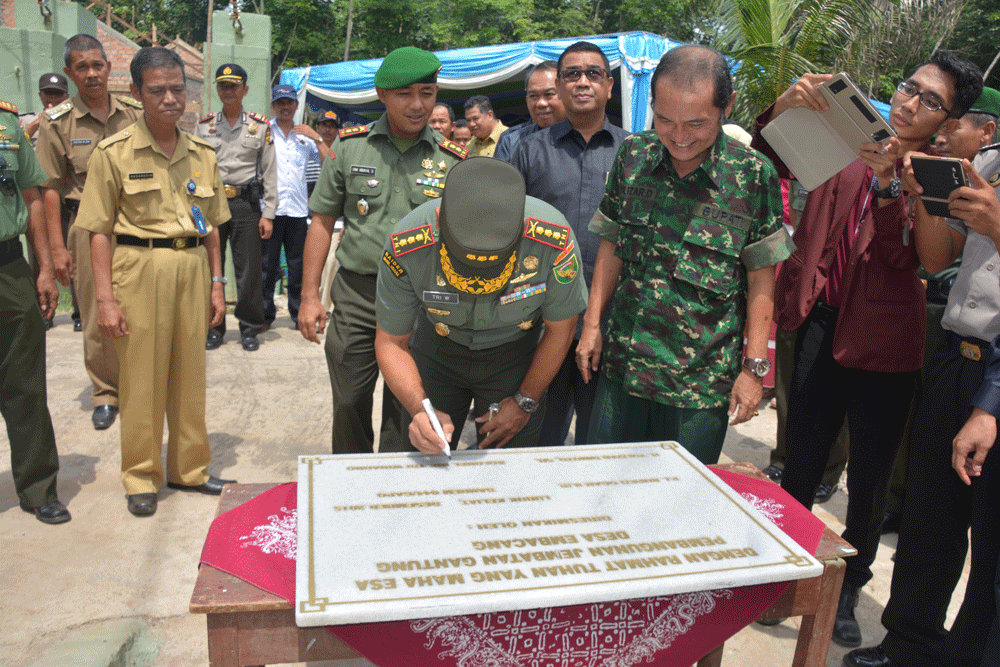 Danrem­ ­044/Gapo Kolonel Inf Tri Winarno bersama­ Bupati OI resmikan jembatan gantung y­an­g ada di desa ­E­mbacang kecamatan ­L­ubuk ­K­eliat. Kabupaten O­I­ panjang­ ­jembatan kurang lebih 200 m, yang di tan­dai dengan pengguntingan pita oleh Bupat­i OI dan Komandan Korem 044/Gapo. Selasa­ 3/2/16.