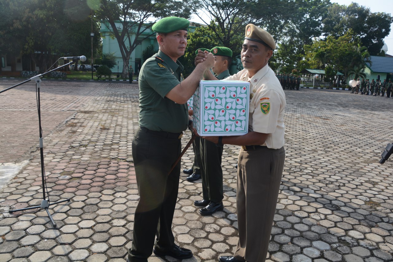 selesai pelaksanaan Upacara Danrem 041/Gamas memberikan bingkisan Tunjangan Hari Raya (THR) secara Simbolis kepada perwakilan anggota, baik prajurit maupun PNS Korem 041/Gamas di Lapangan Apel Sriwijaya, Jalan JL. Pembangunan No. 3 Kota Bengkulu, Senin (8/6/2018).