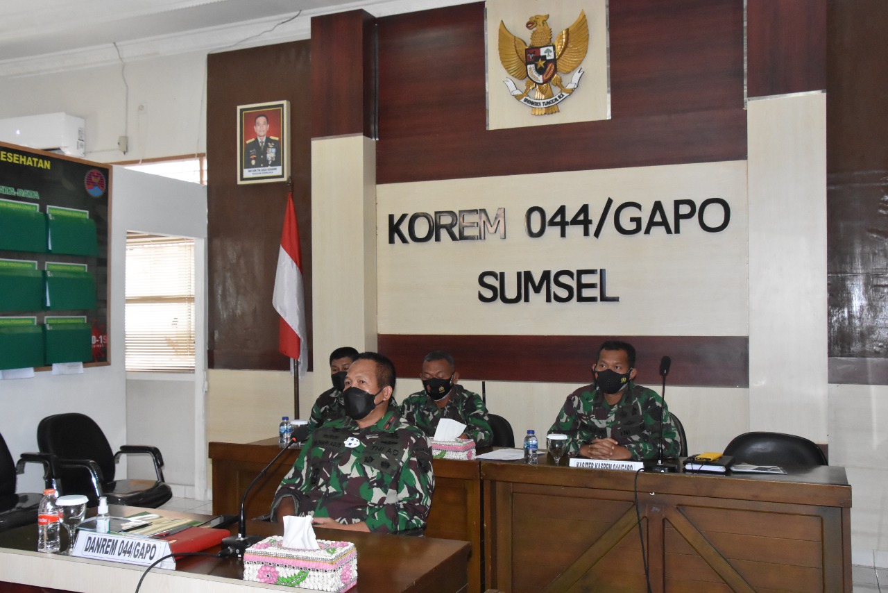 Komandan Korem 044/Gapo Brigjen TNI Jauhari Agus Suraji S.I.P., S.Sos mengikuti kegiatan Rakornis TMMD ke-112 TA 2021 secara vidcon, Kamis (26/8/21).