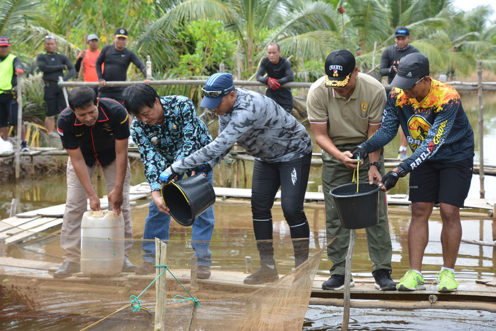 Komandan Korem 044/Garuda Dempo Kolonel Inf Kunto Arief Wibowo, S.IP. bersama Camat Sungsang Sopian Permana didampingi Komandan Kodim 0401/Muba Letkol Czi Mulyadi, S.IP., Danramil 401-06/Sungsang Kapten Inf Kusnandar, Kapolsek Sungsang AKP Samingun serta seluruh Kades se-Kecamatan Sungsang melakukan penebaran Bios 44 di kolam ikan dan kebun kelapa di Desa Marga Sungsang Kec. Sungsang Kab. Banyuasin, Jumat (19/1/2018).