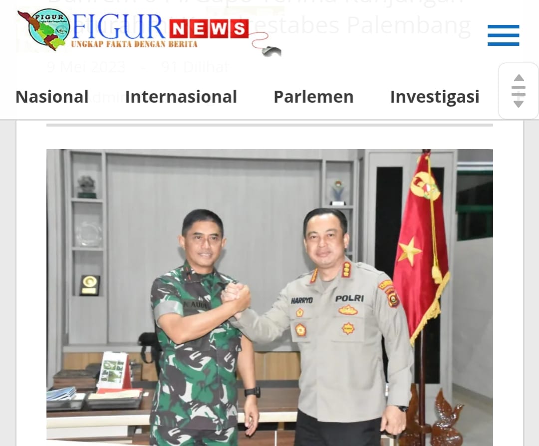 Palembang, Halosumsel – Danrem 044/Gapo Brigjen TNI M. Naudi Nurdika, S.I.P., M.Si., M.Tr (Han), menerima kunjungan silaturahmi Kapolrestabes Palembang, Kombes Pol Harryo Sugihartono, S.IK., M.H beserta jajaran, bertempat di Ruang kerja Danrem 044/Gapo, Jl. Jend. Sudirman KM.4 No.5 Kota Palembang. Selasa (9/5/2023).