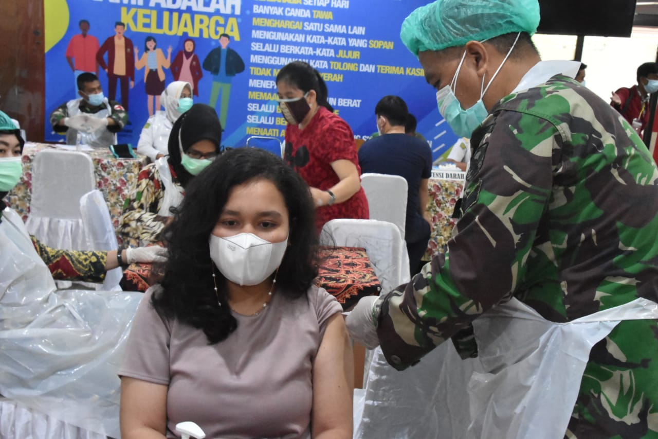 Komandan Korem 044/Gapo Brigjen TNI Jauhari Agus Suraji S.I.P., S.Sos meninjau kegiatan serbuan vaksin yang bertempat di Ruang Fakultas Bisnis Dan Akuntansi Universitas Katholik Musi Cahritas Jalan Bangau Palembang, sabtu (3/7).