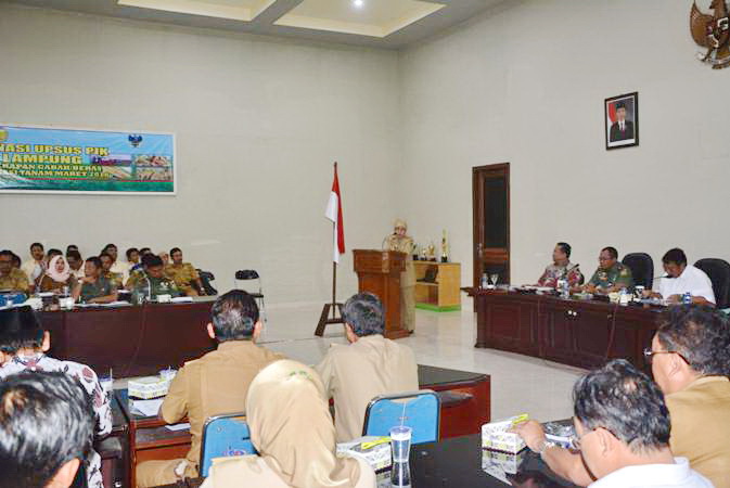 Rapat langsung dipimpin Danrem 043/Gatam, Kolonel Inf. Joko P.Putranto M.Sc. Hadir dalam kesempatan tersebut Para Dandim Jajaran Korem 043/Gatam, Kepala Dinas Pertanian Prov.Lampung, Ka Bakorluh Provinsi Lampung, Ka BPS Provinsi Lampung, Ka BMKG Provinsi Lampung, Kepala Balai Besar Wilayah Sungai Mesuji- Sekampung, Ka Bulog Provinsi Lampung, Kadis Pertanian Kab/Kota Provinsi Lampung, Tim Upsus Provinsi Lampung dan Tim Upsus Pokja Pusat.