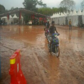 Tidak menyangka datang hujan, karena derasnya hujan tersebut membuat diarea lokasi kawasan alu-alun tempat diselenggarakan berbagai pameran atas keberhasilan pembangunan yang menunjang kehidupan masyarakat Banyuasin saat sekarang menjadi sejahtera spontan berubah berlumpur.