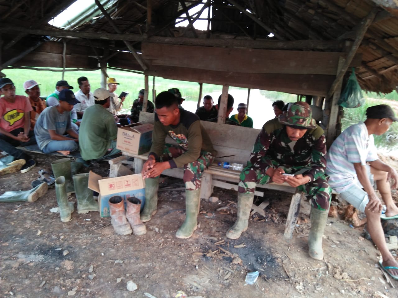 Tampak terlihat beberapa anggota satgas TMMD Kodim Palembang bercengkrama dengan warga Pulo kerto ,