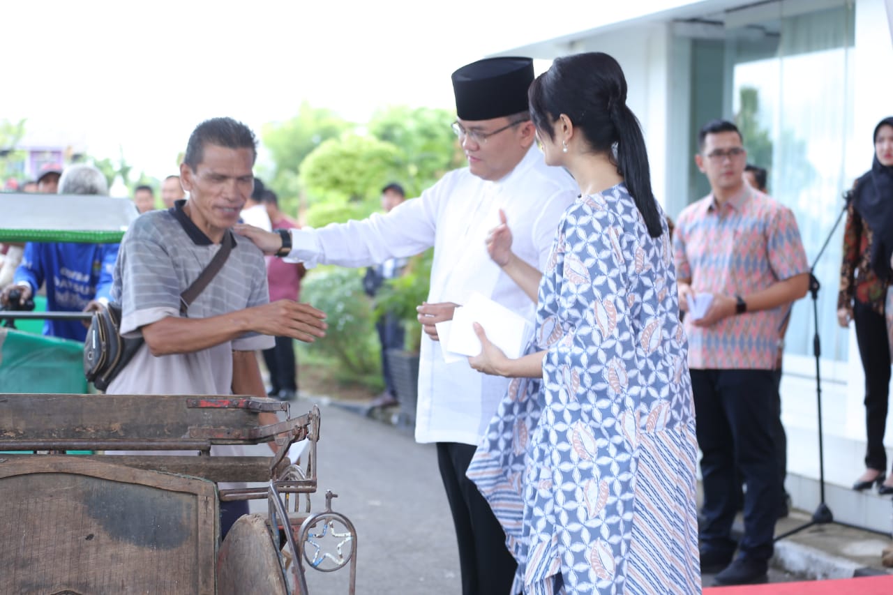 Hari ini di pendopoan rumah dinas Bupati Muba, tampak H Dodi Reza Alex Noerdin yang Bupati Musi Banyuasin (Muba) didampingi istrinya, Hj Thia Yufada, (Ketua TP PKK Muba), membagikan Zakat Mal. Sejak pagi tampak ribuan becak dan ojek terpakir rapih di sisi jalan depan persis pintu gerbang kediaman bupati.