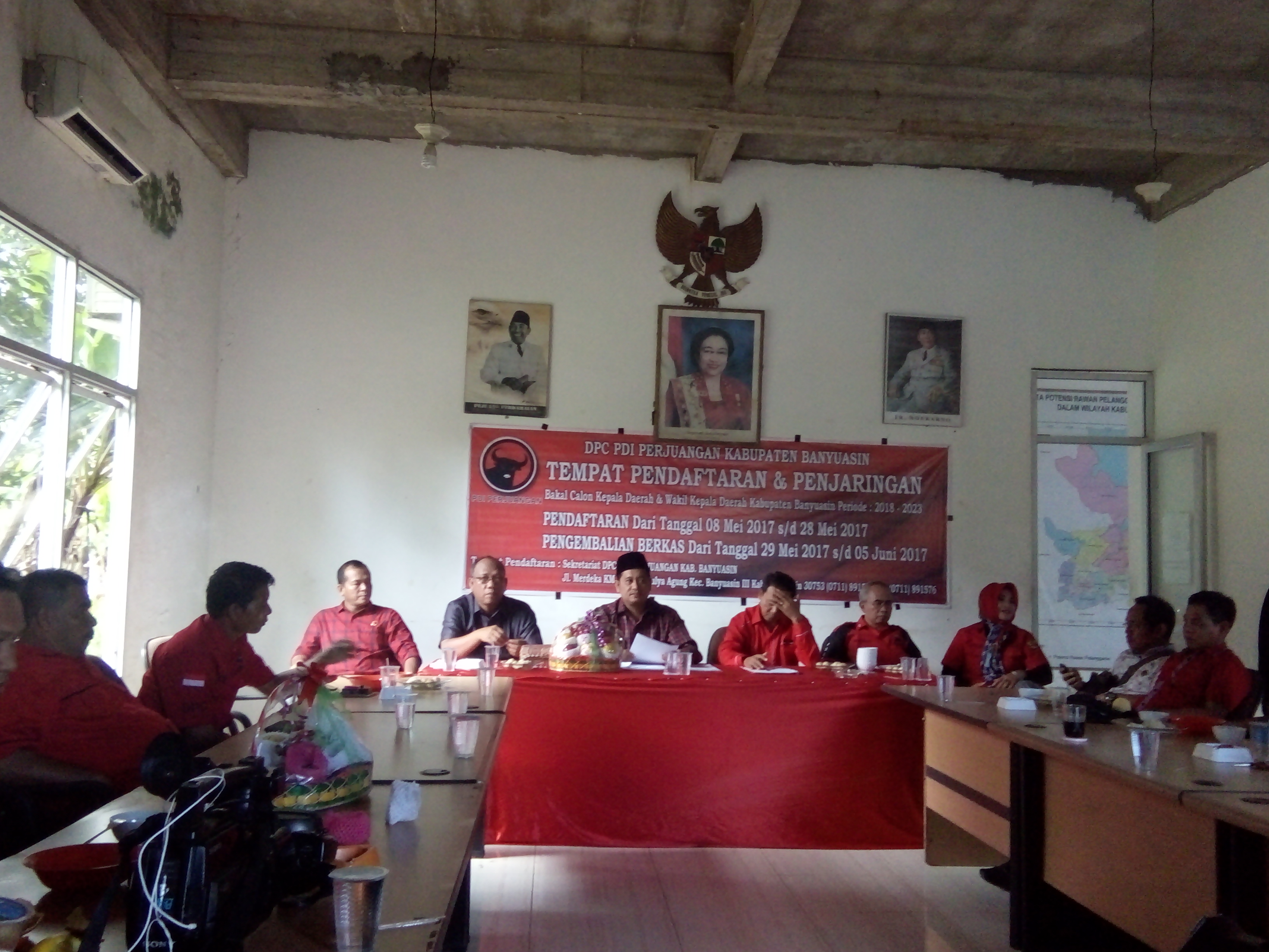 Dewan Perwakilan Cabang Partai Demokrasi Indonesia Perjuangan (DPC.PDIP)Kabupaten Banyuasin, secara menyuluruh mengawali penjaringan pencalonan Bupati dan wakil Bupati Banyuasin periode 2018-2019 di skretariat kantor DPC PDIP Banyuasin dalam konferensi pers. Senin (8/5/2017).