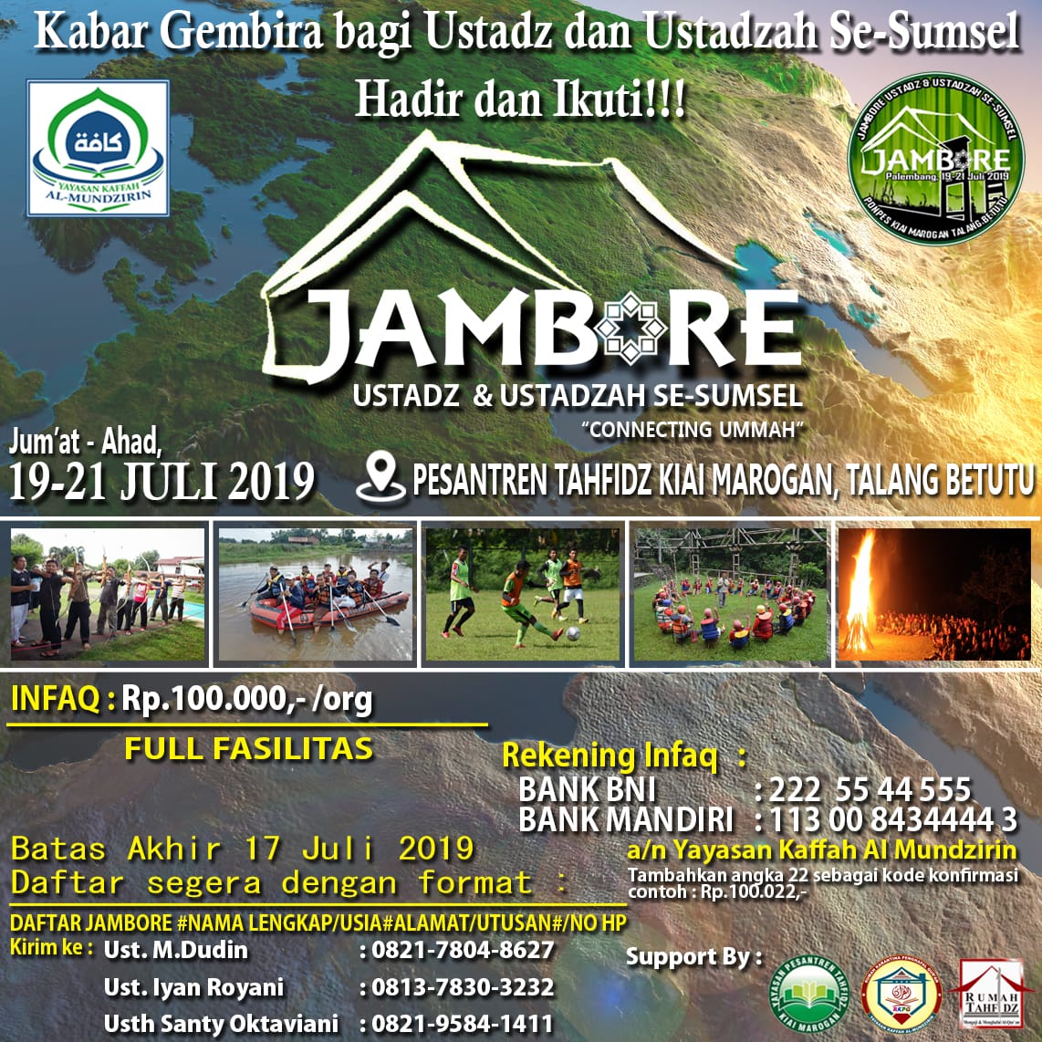 Dua pekan lagi, Jambore Ustadz dan Ustadzah se-Sumsel, akan digear di Pondok Pesantren Tahfidz Quran Kiai Marogan Talang Betutu Palembang, 19-21 Juli 2019. Ustadz Hoiril Anam, personil panitia Jambore menjelaskan hingga saat ini sudah 40 % peserta di Sumatera Selatan yang sudah memastikan hadir dalam acara tersebut. Peserta terdiri dari rumah tahfidz atau pondok pesantren tahfidz di Sumatera Selatan.