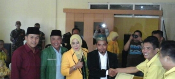 Emi Sumitra, Anggota DPRD Kabupaten Banyuasin dari Fraksi Kebangkitan Bangsa (PKB) mengambil formulir bakal calon Wakil Bupati Banyuasin di DPD II Partai Golkar Kabupaten Banyuasin,Selasa (11/7/2017).