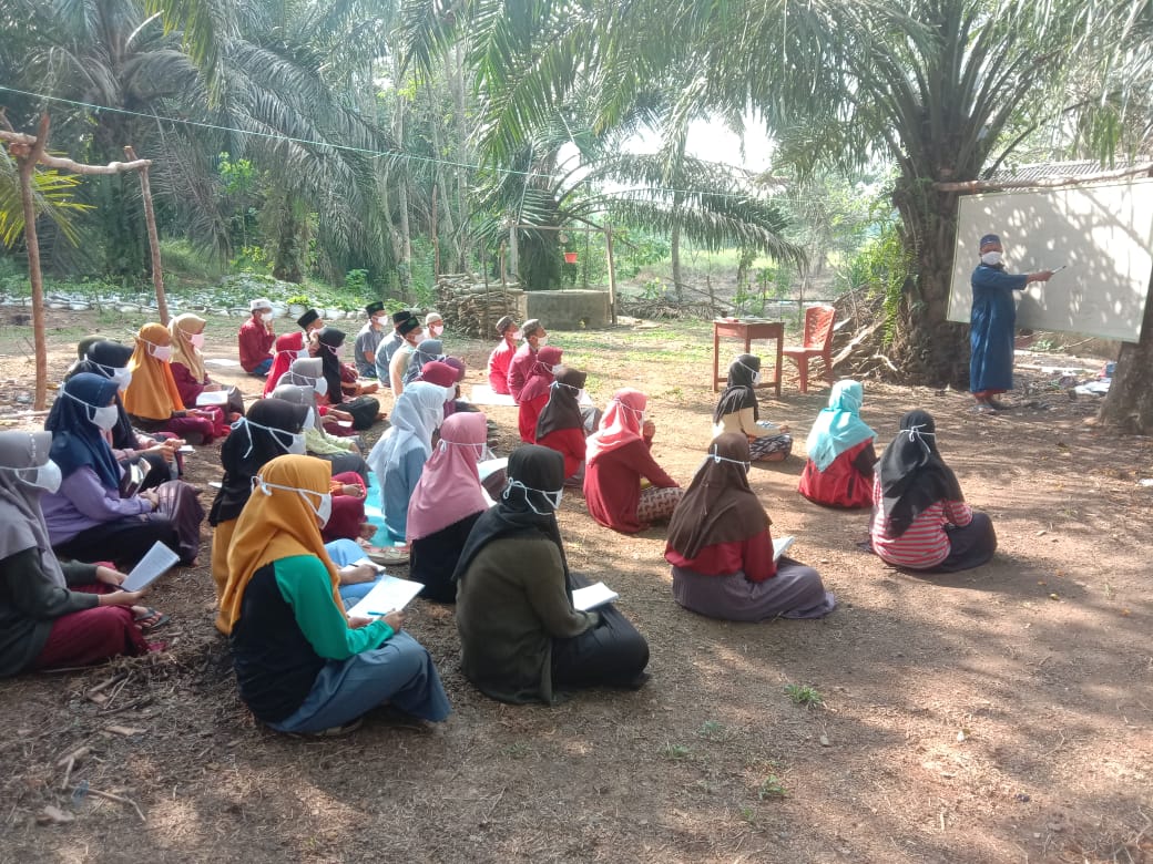 Sekalipun belajar di bawah pohon sawit dan di alam terbuka para santri tampak sangat antusias dalam menyimak semua pelajaran yang disampaikan.