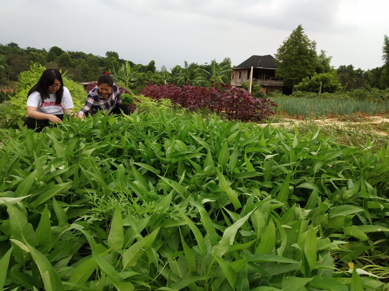Febrita ditemani anak-anak dan keluarga besarnya memilih berkebun dan memanen sayur mayur di halaman kediamannya di Villa Gandus Jalan Talang Kepuh, Kecamatan Gandus.