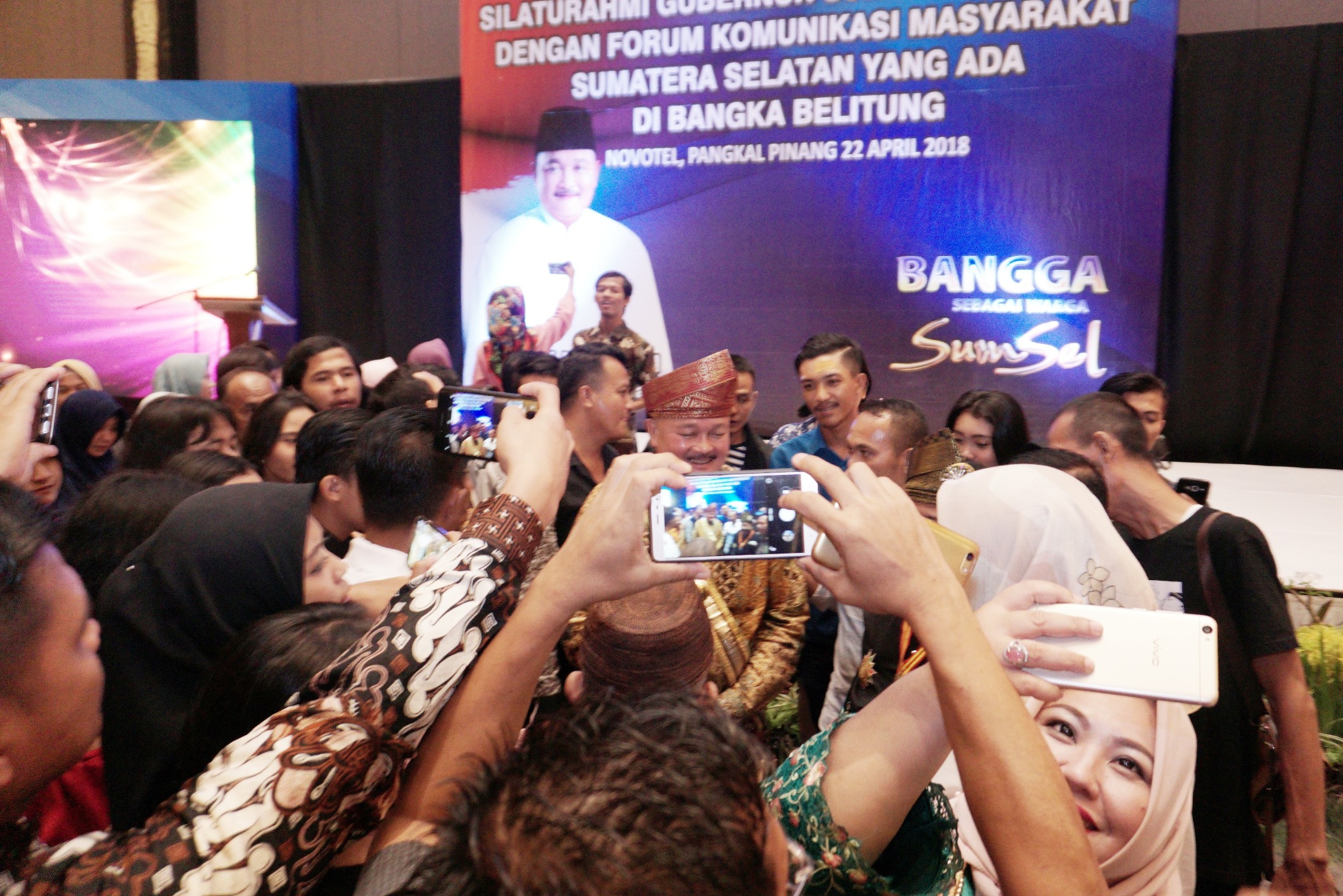 Mengobati kerinduan warganya (Sumsel) yang menetap di Kepulauan Bangka Belitung, Gubernur Sumsel Alex Noerdin berkunjung ke Kota Pangkal Pinang, Bangka Belitung Minggu (22/4) di Hotel Novotel. Selain bersilaturahmi, kedatangan Pelopor Sekolah Gratis ini juga sekaligus dalam rangkaian mensosialisasikan Asian Games XVIII 2018.