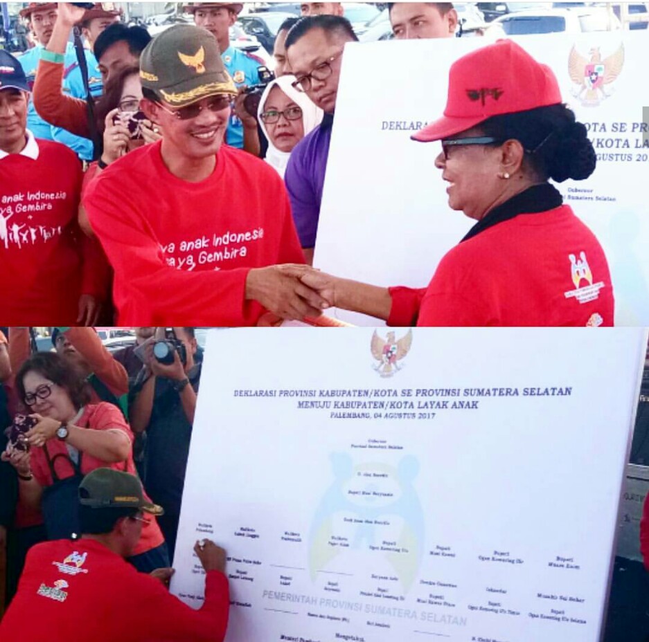 tanda tangan deklarasi oleh Wallkota Palembang H. Harnojoyo yang disaksikan oleh Menteri Pemberdayaan Perempuan dan Perlindungan Anak Yohana Susana Yembise dan Gubernur Sumsel H. Alex