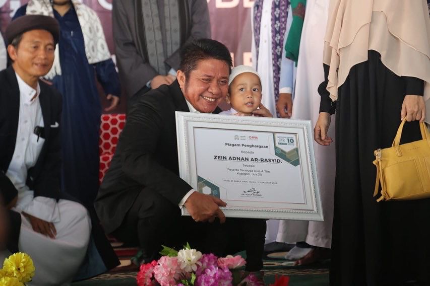 Usai prosesi wisuda Herman Deru mengalungkan penghargaan kepada peserta berumur 4 Tahun kategori penghafal Juz 30 dari Rumah Tahfidz Al-Ikhlas Tanjung Batu Kabupaten Ogan Ilir.