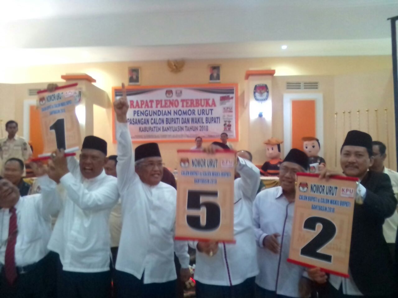 Komisi Pemilihan Umum (KPU) Kabupaten Banyuasin menetapkan nomor urut bagi lima pasangan calon peserta pilkada serentak yang akan digelar pada Juni 2018.