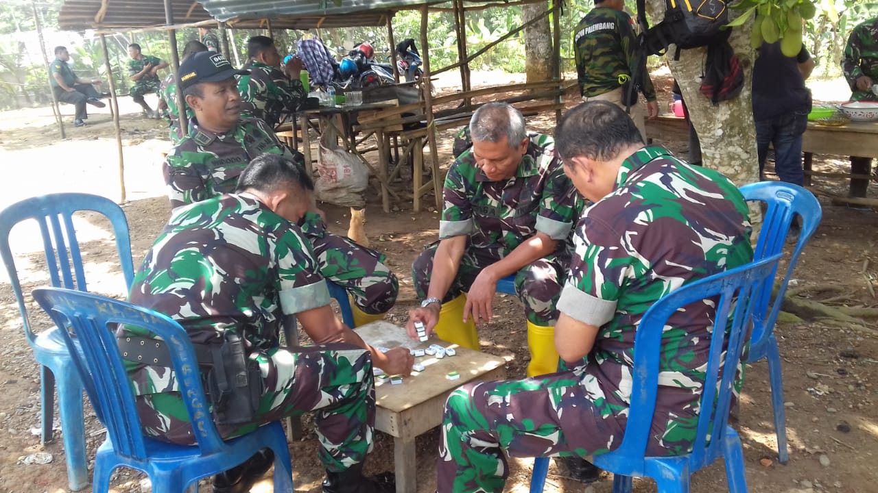 Mengisi waktu rehat setelah melakukan pekerjaan satgas TMMD ke 104 Kodim Palembang di Kampung Sungai Rengas Kelurahan Pulokerto Kecamatan Gandus Palembang dengan bermain gaple