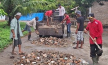 Kegiatan gotong royong kali ini sengaja difokuskan pada pemulihan rusak di Dusun Barat 4 menuju Dusun 5 yang disebabkan guyuran hujan dan kendaraan roda empat yang melintasi jalan tersebut.