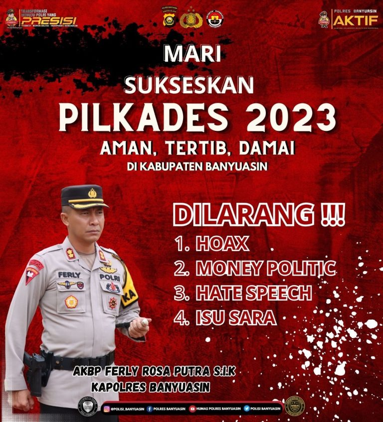 Banyuasin, Halosumsel- Besok, Sabtu 9 September 2023, di Bumi Sedulang Setudung (Banyuasin) bakal menggelar Pemilihan Kepala Desa (Pilkades) serentak di 48 desa. Pesta demokrasi tingkat desa tersebut Kapolres Banyuasin AKBP Ferly Rosa Putra, SIk menghimbau baik kepada para kandidat maupun masyarakat agar mensukseskan Pilkades aman, tertib dan damai. “Pada Pilkades ini dilarang hoax, money politik, hate speech dan isu sara,”ujar Kapolres.