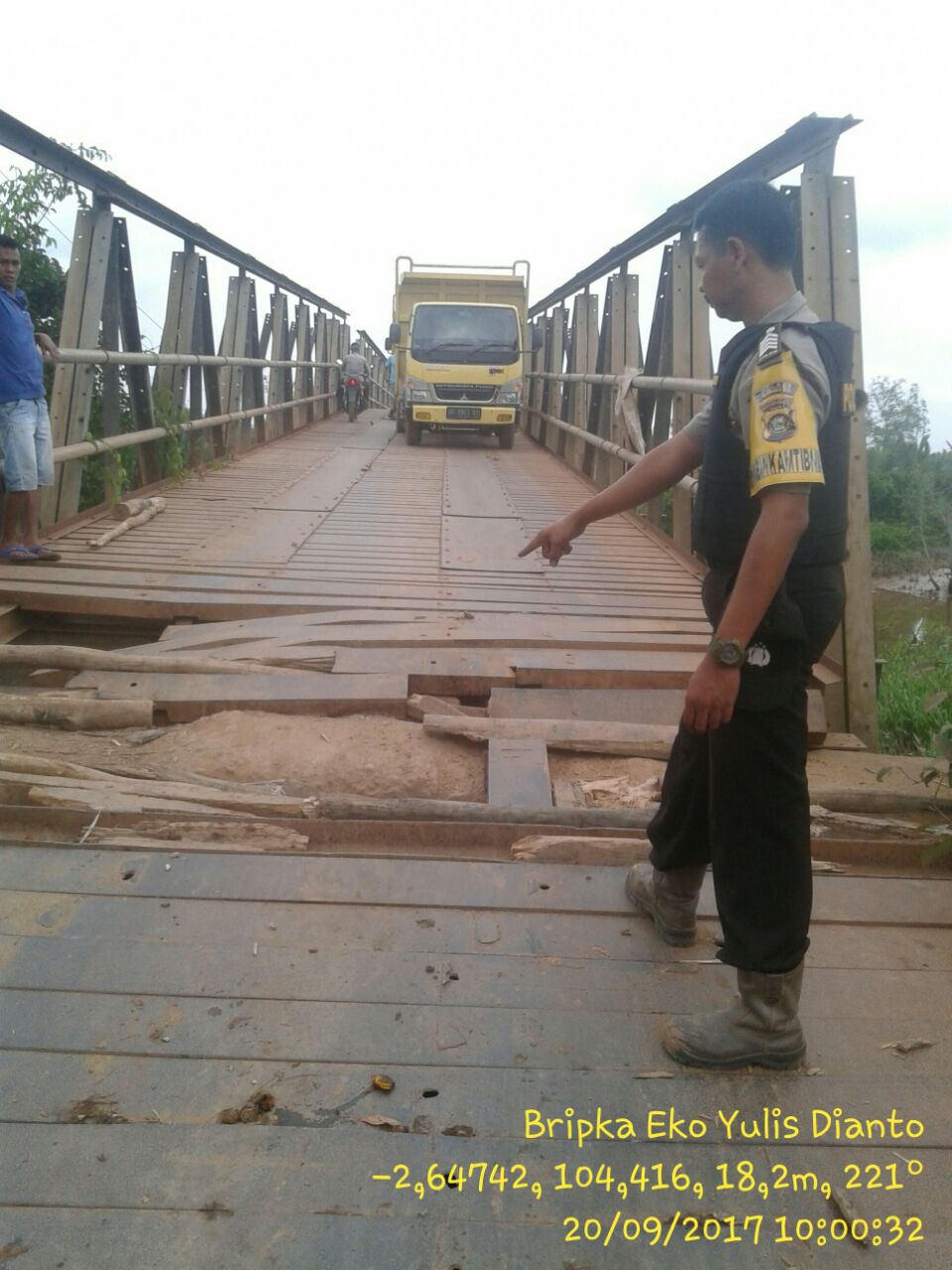 Terkait dengan hal tersebut, Rabu (20/9) sekira jam 10.30 WIB, Personil Bhabinkamtibmas Polsek Pulau Rimau Brigadir Eko Yulisdianto melaksanakan giat patroli dengan melakukan pengecekan jembatan yang saat ini mengalami patah dan sudah rusak parah sehingga sangat membahayakan pengendara ranmor yang melintas.