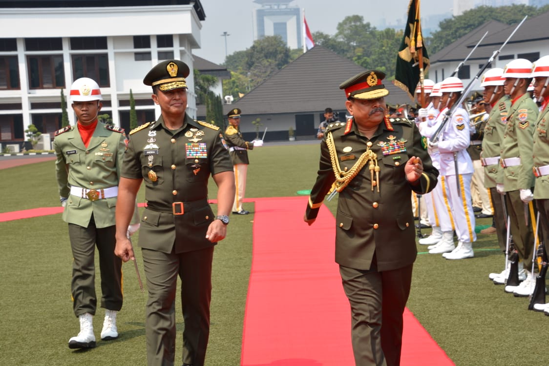 Kepala Staf TNI Angkatan Darat (Kasad) Jenderal TNI Andika Perkasa dengan didampingi Ketua Umum Persit KCK Ny. Hetty Andika Perkasa menerima kunjungan kehormatan Kasad Bangladesh, General Aziz Ahmed, BSP, BGBM, PBGM, BGBMS, psc, G beserta Madame Dilshad Nahar Aziz dan rombongan di Markas Besar Angkatan Darat (Mabesad), Jakarta Pusat, Selasa (20/8/2019). Kedatangan General Ahmed Aziz di Mabesad tersebut disambut dengan jajar kehormatan militer.