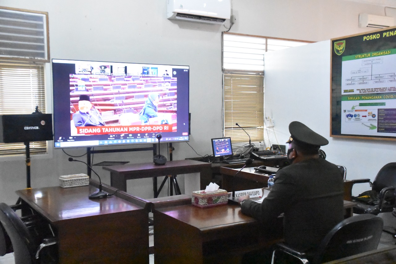 Kepala Staf Korem (Kasrem) 044/Gapo Kolonel Inf Grandy Mangiwa, mengikuti dan mendengarkan pidato Kenegaraan Presiden RI Bapak Ir H. Joko Widodo, Senin (16/8/2021). Bertempat di Ruang vicon Korem 044/Gapo jalan Jenderal Sudirman Km 4.5 Palembang. Pidato Kenegaraan Presiden RI Dalam Rangka Memperingati HUT RI Ke-76.