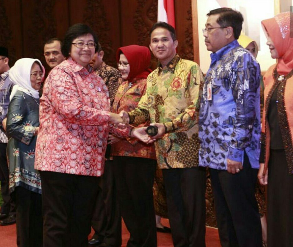 Penghargaan diserahkan Iangsung oleh menteri Lingkungan Hidup dan kehutanan Siti Nurbaya kepada walikota Pa|embang yang diwakili olehKepala Dinas Lingkungan Hidup dan Kebersihan Kota Pa|embang Faizal AR. (sofuan/humas)