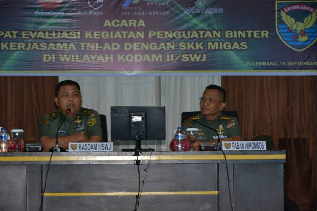 Sebagai tindak lanjut dari penandatanganan Perjanjian Kerjasama (MoU) antara TNI AD dengan Konsorsium SKK Migas Sumbagsel dan para Pimpinan Kontraktor Kontrak Kerja Sama (K3S) yakni : PT Medco E & P Indonesia, PT Petrochina International Jabung Ltd., Job Pertamina Talisman Jambi Merang, tentang penguatan Binter di wilayah kerja kegiatan usaha hulu minyak dan gas bumi. Kamis (15/9/2016), pejabat dari SKK Migas, Pejabat dari Staf Teritorial TNI AD dan Pejabat Kodam II/Swj yang terlibat langsung dalam pelaksanaan tugas di lapangan, menggelar Rapat Evaluasi kegiatan Penguatan Binter Wilayah yang dipimpin Kasdam II/Swj Brigjen TNI Marga Taufiq SH,MH bertempat di Gedung Jenderal Sudirman, Makodam II/Swj.