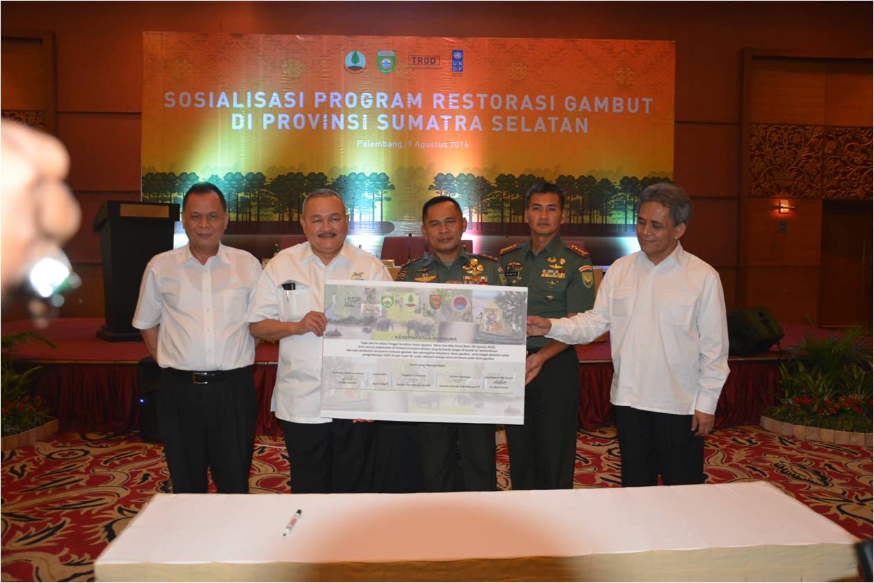 Penandatanganan MoU dilakukan oleh Koordinator Tim Restorasi Gambut Sumsel dan Komandan Korem 044/Gapo Kolonel Inf Kunto Arif Wibowo, yang disaksikan langsung dan diketahui oleh Gubernur Sumsel H. Alex Noerdin, Pangdam II/Swj Mayjen TNI Sudirman SH, MM dan Sekretaris Badan Restorasi Gambut (BRG), Ir. Hartono Prawiraatmadja, M.Sc.