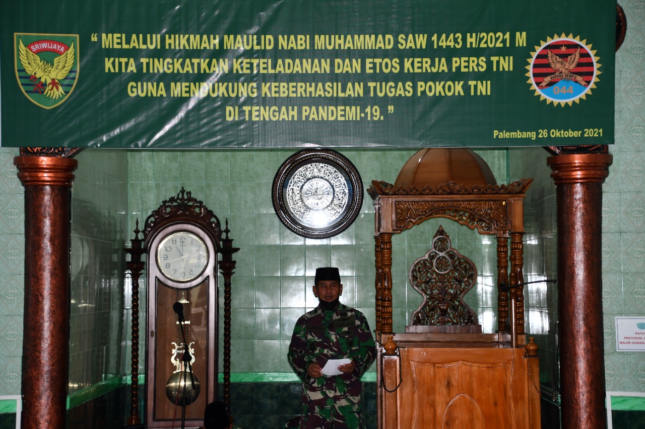 Peringatan kali ini mengusung tema “Melalui Hikmah Maulid Nabi Besar Muhammad SAW Tahun 1443 H/2021 Kita Tingkatkan Keteladanan  Dan Etos Kerja Personel TNI Guna Mendukung Keberhasilan Tugas Pokok TNI di Tengah Pandemi Covid-19”, Rangakaian kegiatan diawali dengan Pembacaan Ayat Suci Al – Quran oleh Letda Inf Samsul Rizal, Sambutan Danrem 044/Gapo dan Ceramah Maulid Nabi Muhamad SAW oleh Bapak Ustadz H. Arwandi Zainuri, S.Sos.i