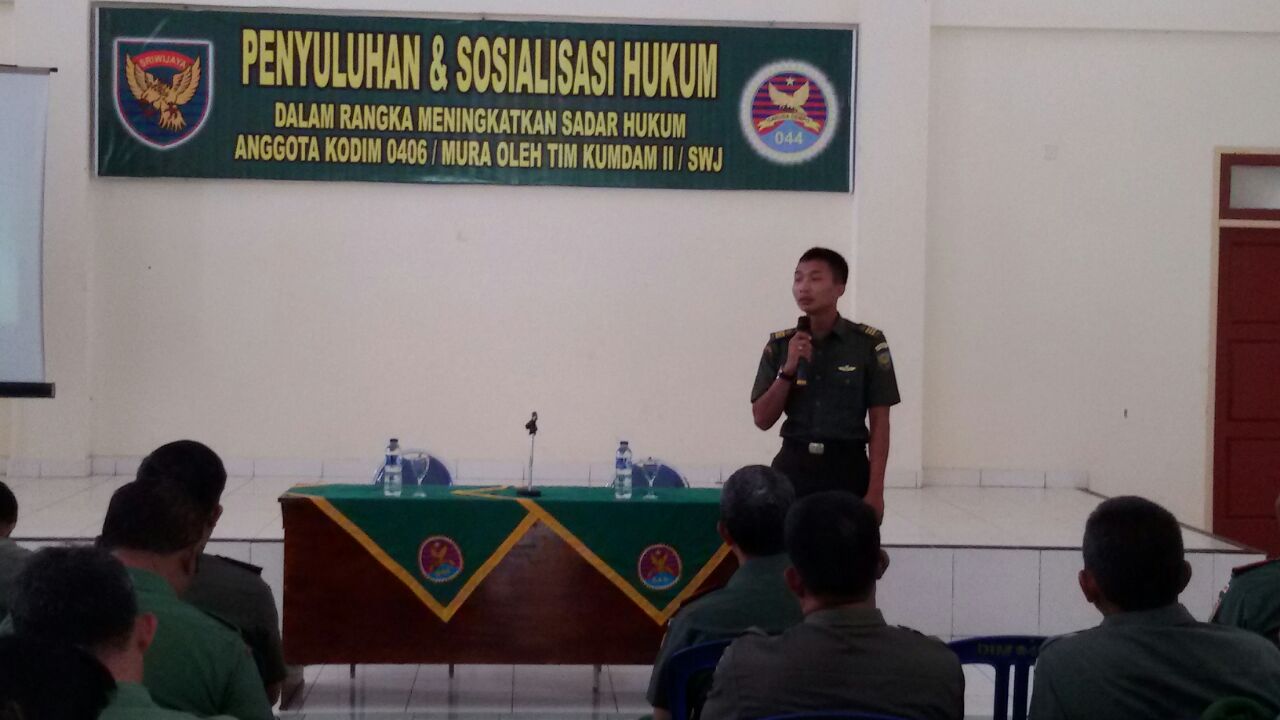 Anggota Kodim dan Yonif jajaran Korem 044/Gapo baik personel militer maupun ASN (Aparatur Sipil Negara) TNI AD mengikuti penyuluhan hukum yang disampaikan oleh penyuluh dari Kumdam II/Sriwijaya bertempat di Aula masing-masing satuan, Rabu (31/8/16).