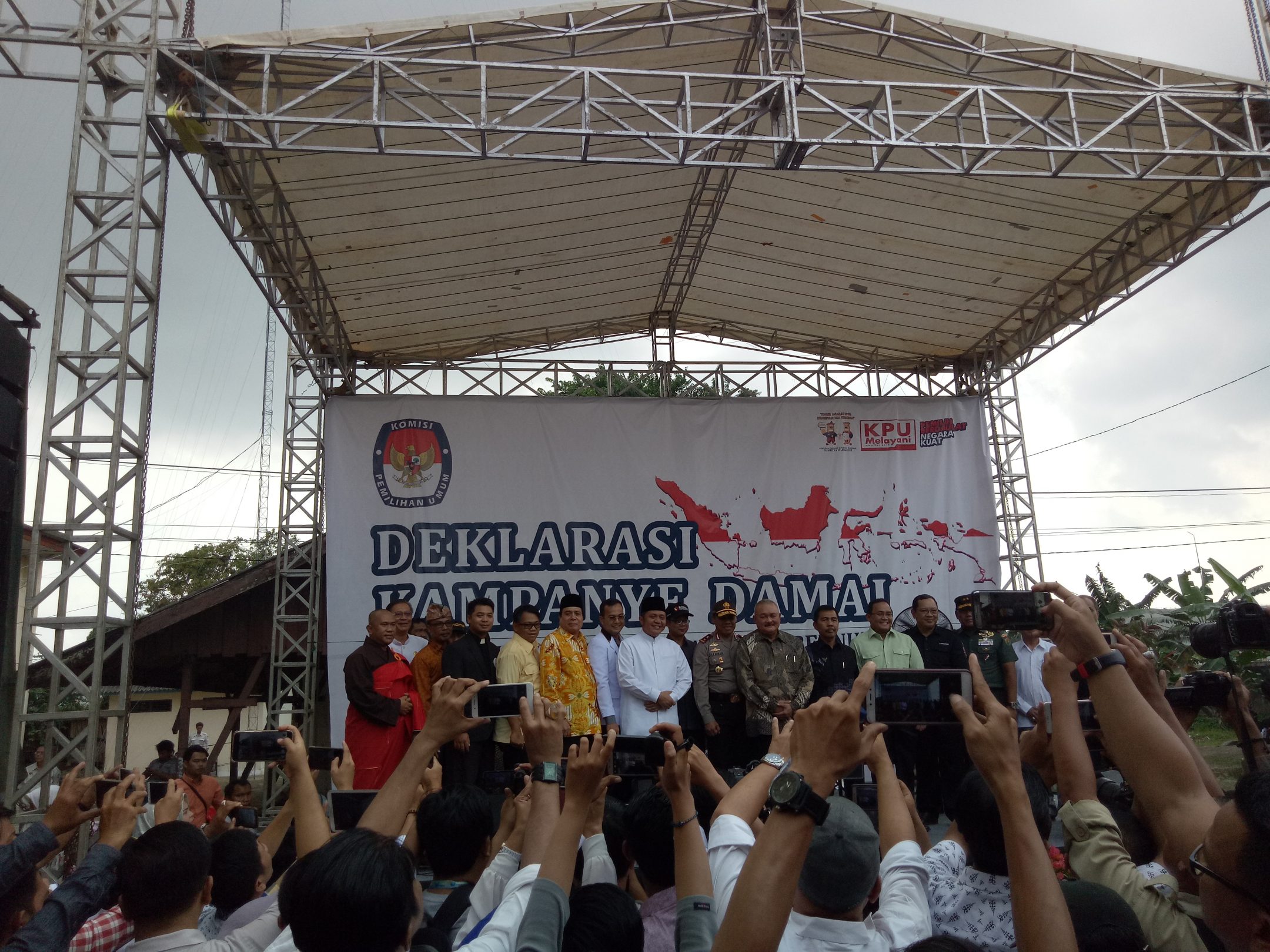 Deklarasi kampanye damai pemilihan gubernur dan wakil gubernur sumatera selatan yang berlangsung di halaman KPU Sumsel di jalan P angeran Ratu Jakabaring Minggu (18/2) Palembang berlangsung lancar meski tidak semua paslon hadir dalam kesempatan tersebut KPU Sumsel mewaspadai isu sara dan penyebaran berita hoax dalam upaya kampanye hitam