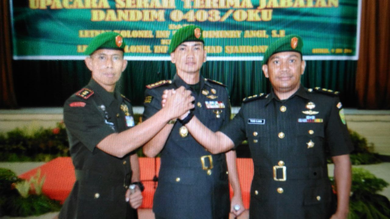 Danrem 044/Gapo Kolonel Inf Kunto Arief Wibowo, S.IP. pimpin serah terima jabatan Komandan Kodim 0403/OKU dari Letkol Inf Feksy Dimunry Angi kepada Letkol Inf Mohammad Sjahroni bertempat di Gedung Kesenian Pemkab OKU Induk Baturaja (9/6/2016).