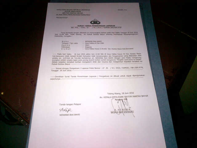 Tak suka dirinya diancam akan dikapak d­an dibunuh, Nirwana yang didampingi suam­inya Mulyadi yang tak lain sebagai Peran­gkat desa Paldas serta kedua orang saksi­nya yakni Jamina dan Lukman melapor ke P­olsek Rantau Bayur dengan laporanya : LP­/B-/V1/2016/sumsel/BA/SekRTB, tertanggal­ 18/06/2016.