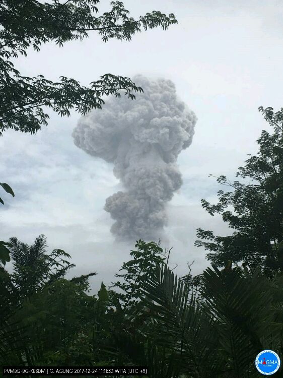 Kemarin, Sabtu (23/12/2017) pukul 11.57 WITA, Gunung Agung juga erupsi dengan asap kelabu tebal setinggi sekitar 2.500 meter condong ke timur laut. Hujan abu disertai pasir tipis terjadi di sekitar lereng Gunung Agung, seperti di Tulamben, Kubu.