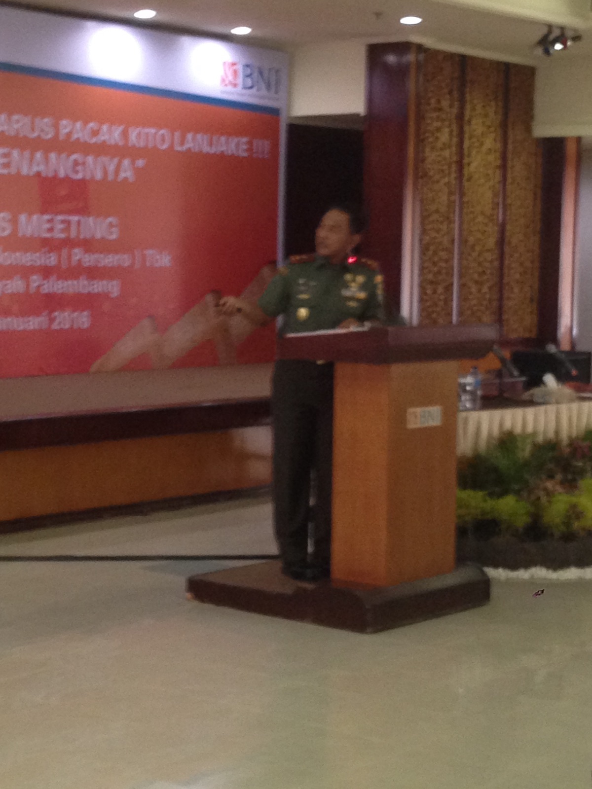 Pangdam II Sriwijaya Mayjen TNI Purwadi Mukson S.IP memberikan pembekalan membangun kesadaran bela negara dalam rangka ketahanan nasional yang di gelar PT. BNI (Persero) Tbk Kantor wilayah Palembang Rabu (13/1) bertempat Aula BNI lt 4 Jl. Sudirman Palembang